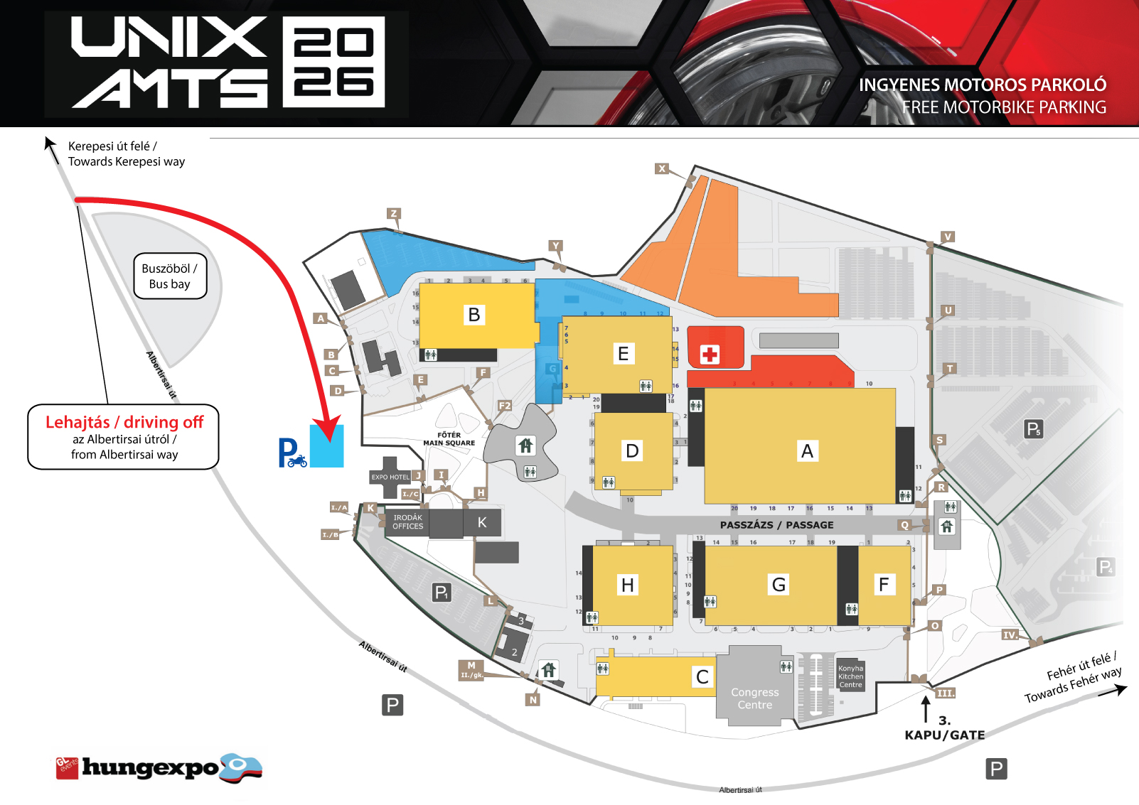 A Hungexpo külterületén ingyenes - nem őrzött! - motoros parkolási lehetőséget biztosítunk az alábbi zónában.